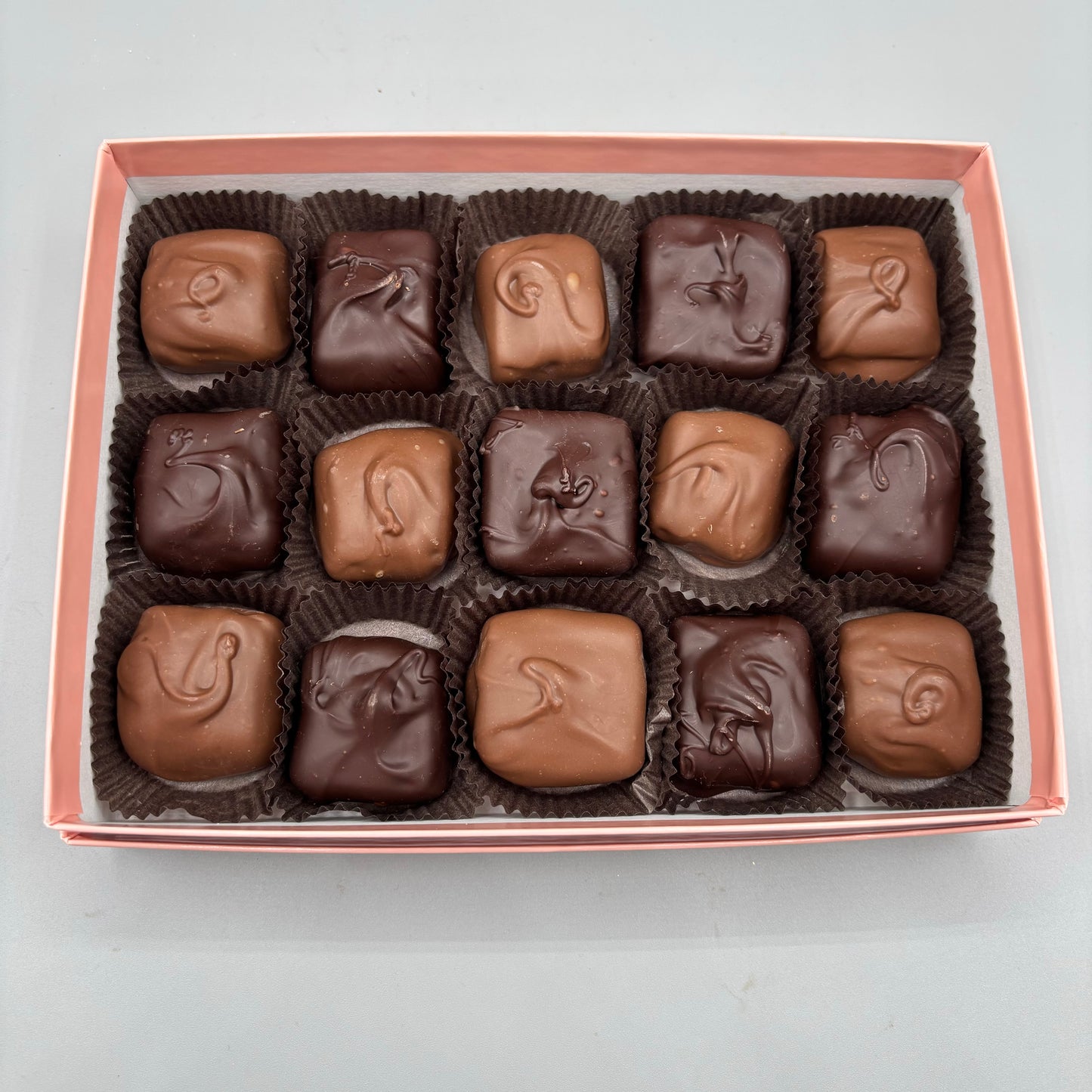 You cannot go wrong with a classic! Each batch of caramel is made from scratch in small batches. Then each piece is hand cut and hand dipped in chocolate, making each caramel perfectly unique! Contains 15 Pieces.