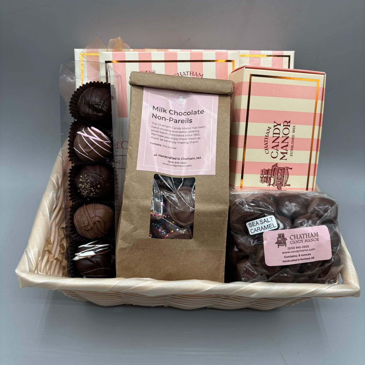 Customize the perfect gift basket by choosing from a variety of Candy Manor favorites! The Large Gift basket allows for a choice of an Assortment, Half Pound of Fudge, Candy Manor Specialty, Chocolate Sleeve, Candy Manor Chocolate Bar, and Chocolate Bagged Favorite.