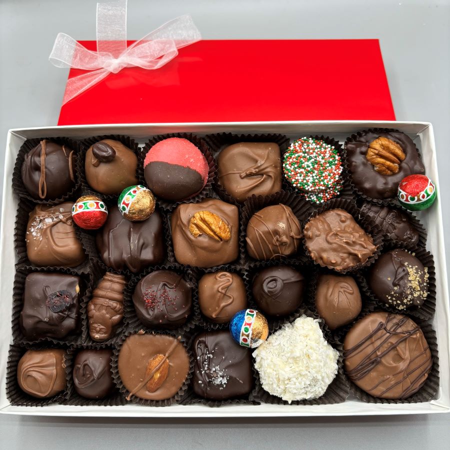 Milk Chocolate Christmas Non-Pareils: Milk Chocolate (see above), Christmas Non-Pareils (Sugar, Corn Starch, Carnauba Wax, Confectioners Glaze, Yellow 5, Yellow 6, Blue 1, Blue 2, Red 3, Red 40).