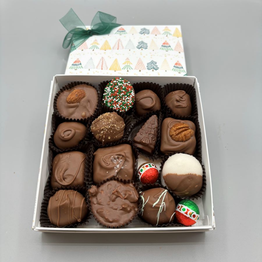 Milk Chocolate Christmas Non-Pareils: Milk Chocolate (see above), Christmas Non-Pareils (Sugar, Corn Starch, Carnauba Wax, Confectioners Glaze, Yellow 5, Yellow 6, Blue 1, Blue 2, Red 3, Red 40).