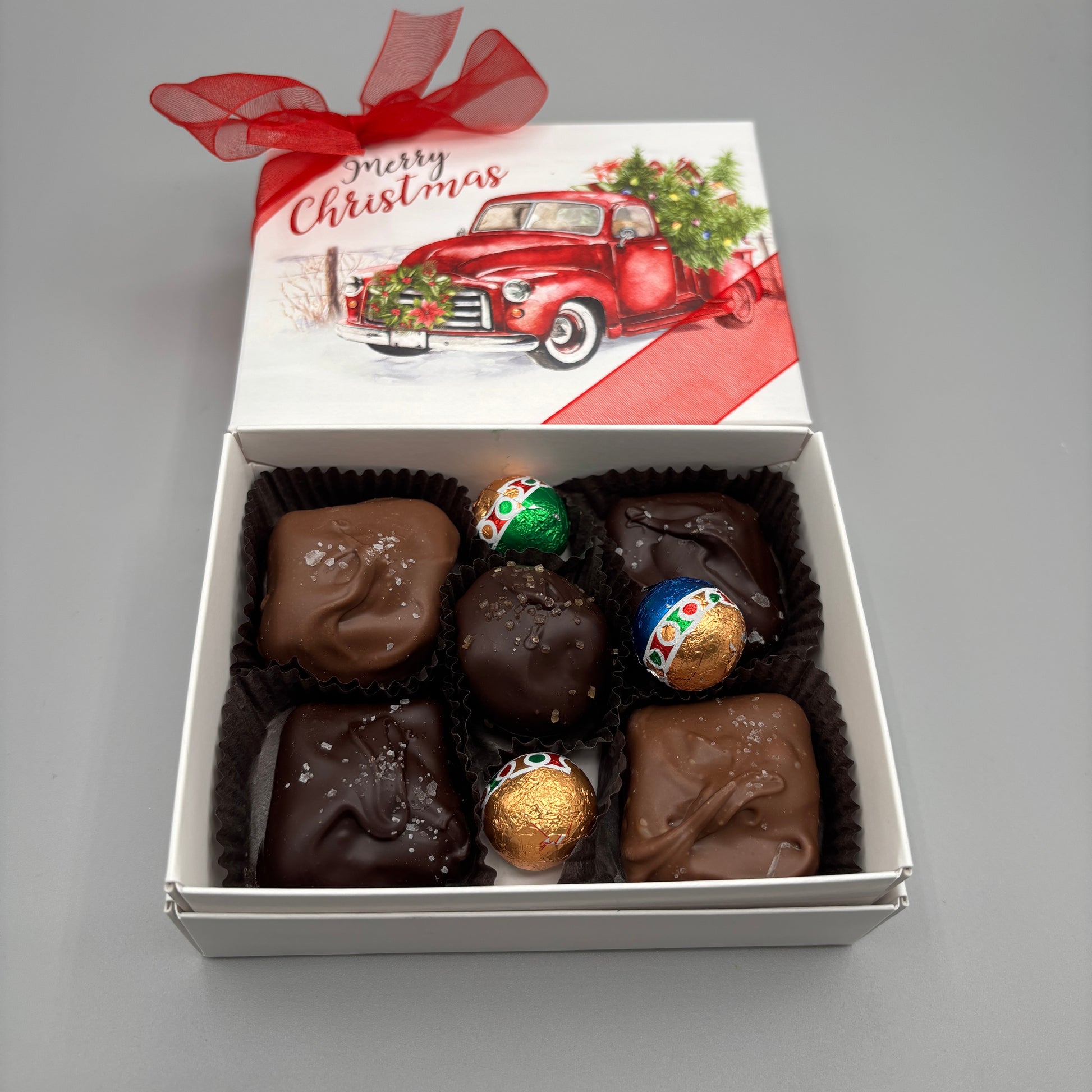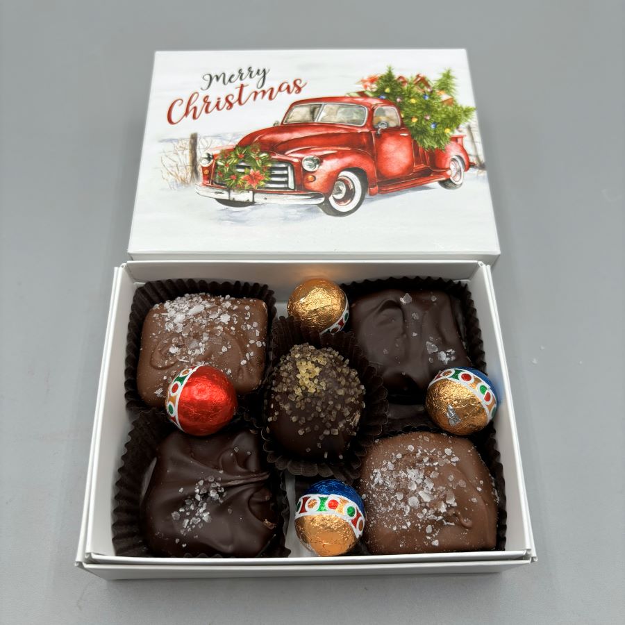 The Red Truck assortment comes with a some milk and dark chocolate salted caramels, a dark chocolate truffle and some foil milk chocolate ornaments!